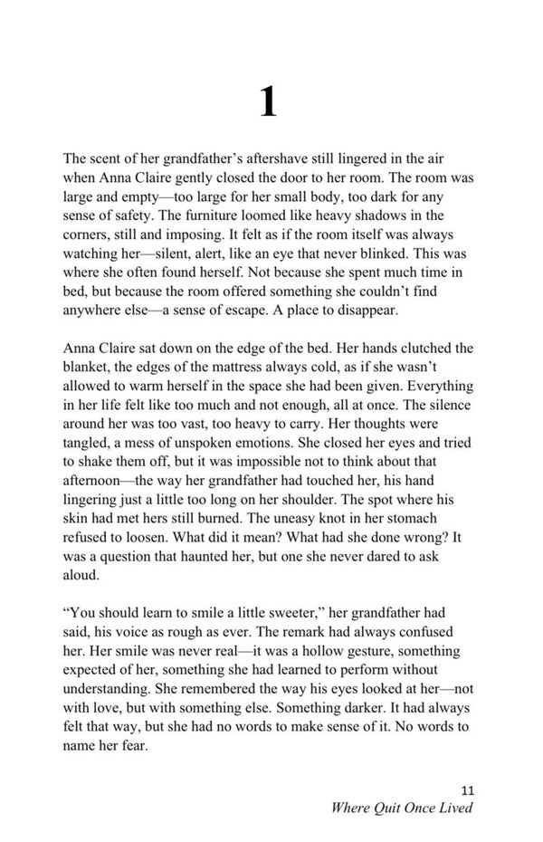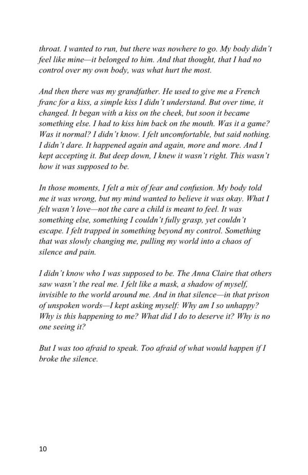 Anna Claires childhood is marked by betrayal, fear, and loss—wounds she kept hidden beneath a fragile silence. As she confronts the shadows of her past, she embarks on a journey toward healing, courage, and freedom.